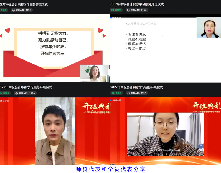 天扬君合财税服务集团产品经理介绍了2022年中级会计职称学习服务教学、教务安排以及学习平台功能;授课老师代表围绕中级会计职称的学习方法、考情分析、学习规划等方面,分享了会计职称考试的学习技巧和方法;学生代表根据自己的备考经验,从学习方法,学习心态分享了自己的成功经验。